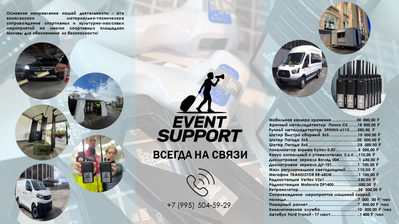 Основное направление нашей деятельности - это комплексное материально - техническое сопровождение спортивных и культурно - массовых мероприятий на многих спортивных площадках Москвы для обеспечения их безопасности!